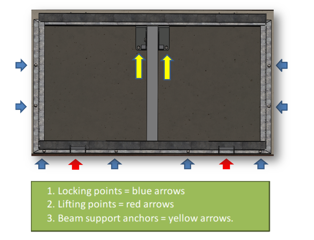 - Frames on multi-part units need to be lifted using the sling points, these are shown in red. Split-frames should only be lifted as separate units, the fixing bolts are only designed to hold the frame in position prior to grouting.