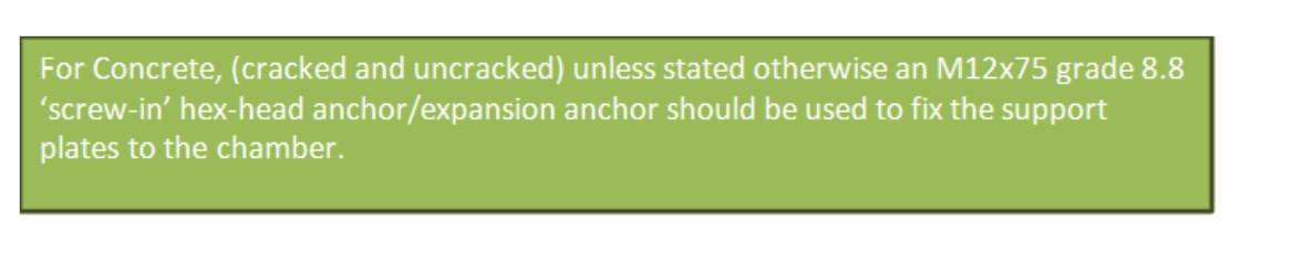 Whether a ‘screw-in’ or expansion type anchors is used will depend on the chamber material and conditions.